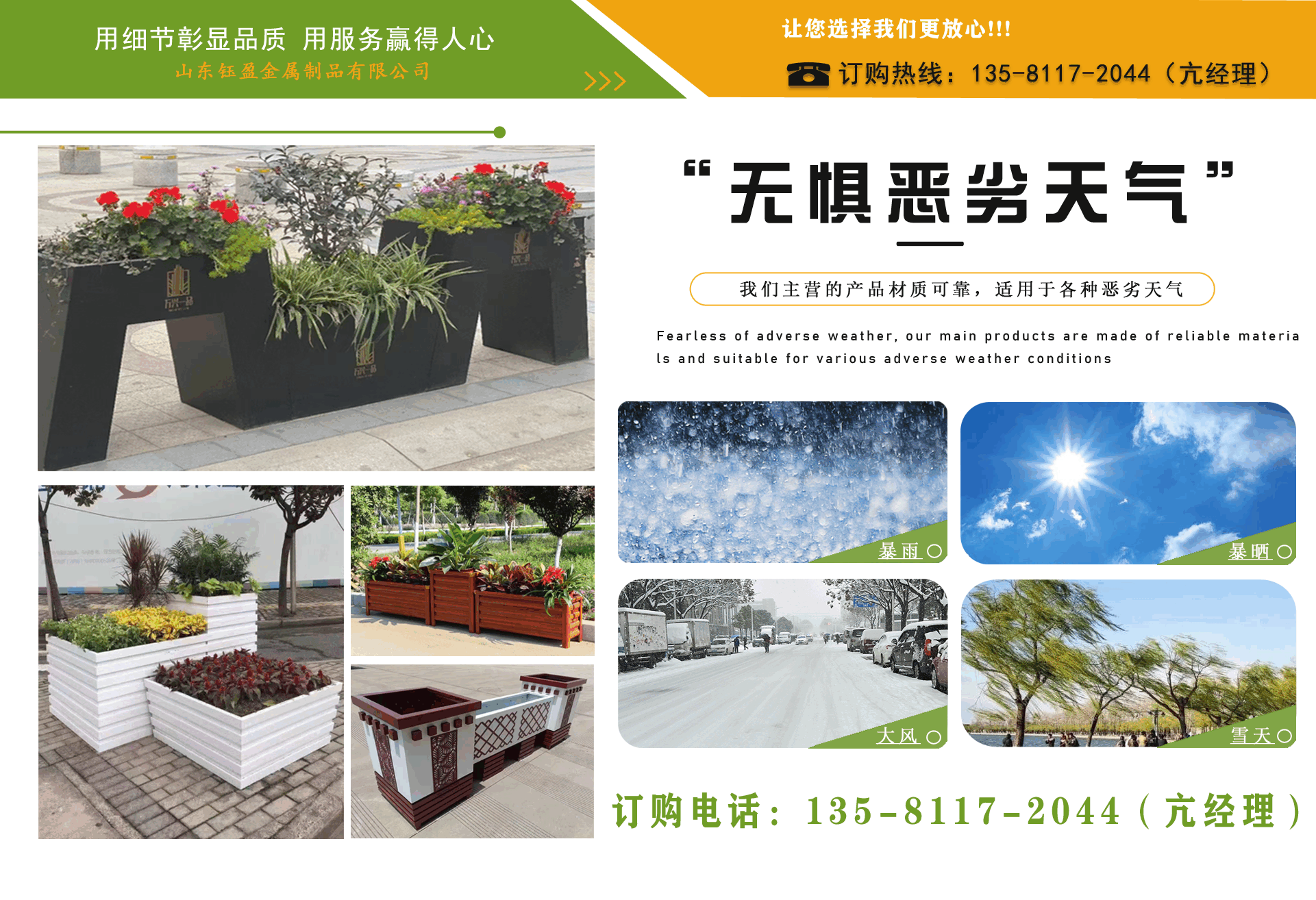 山東鈺盈金屬制品有限公司主營(yíng)鍍鋅板花箱,道路隔斷花箱,定制花箱,戶外道路花箱,花箱座椅等產(chǎn)品,產(chǎn)品結(jié)構(gòu)合理、性能優(yōu)良,具有強(qiáng)度高、耐腐蝕、抗老化、隔熱隔音、節(jié)約能源、外形美觀、使用壽命長(zhǎng)等優(yōu)點(diǎn),深受國(guó)內(nèi)外客戶認(rèn)可。  我們根據(jù)客戶所在城市的文化特征,制造出符合當(dāng)?shù)爻鞘形幕瘹庀⒌淖匀涣Ⅲw、觀賞性強(qiáng)的花箱產(chǎn)品成為城市里一道靚麗的風(fēng)景線。  公司實(shí)行誠(chéng)實(shí)、公正、守信、價(jià)格合理、平等互利。  公司憑借雄厚經(jīng)驗(yàn)實(shí)力,恪守誠(chéng)信為本的原則,得到了眾多客戶的信賴,并在業(yè)界獲得良好的口碑。建立了穩(wěn)固的合作關(guān)系,隨著業(yè)務(wù)的不斷發(fā)展和壯大,合作伙伴的范圍也在不斷擴(kuò)大。我們熱情盼望與您的合作,為社會(huì)的可持續(xù)發(fā)展獻(xiàn)上一份努力。...